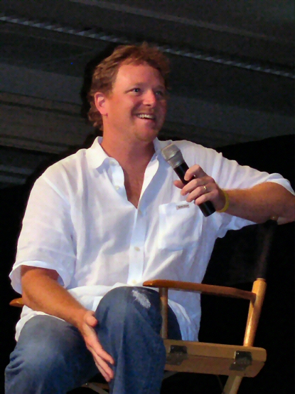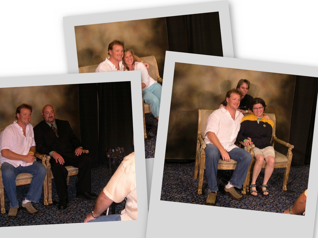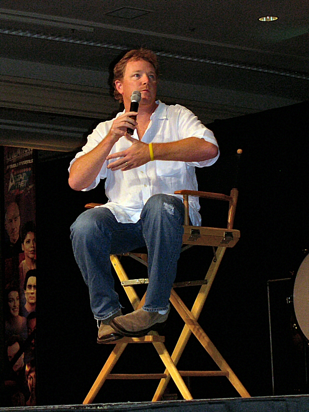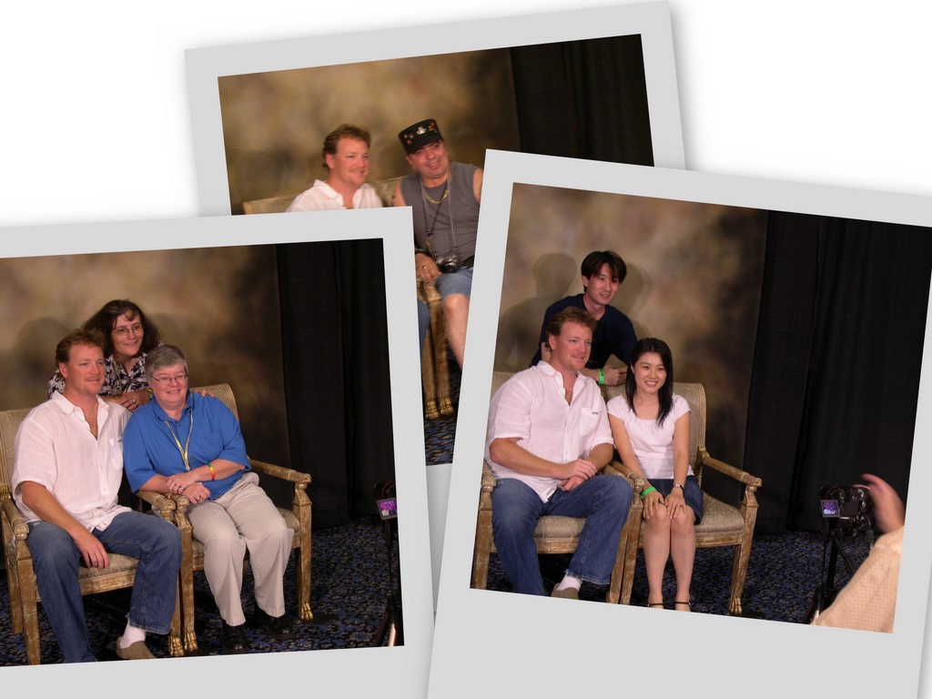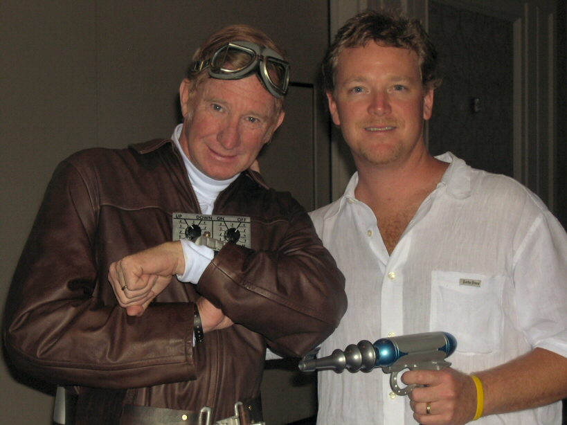 Creation Entertainment's ![]() Robbie onstage ![]() Robbie onstage ![]() Robbie poses with costumed fan Scott Brodeen, who attended Creation's Las Vegas Star Trek event as Captain Proton. ![]() Posing with fans at the convention ![]() Posing with fans at the convention ![]() Robbie enjoying the sun in Vegas ![]() One more smile for the camera! Onstage, Robbie spoke about his new career as a director and responded to questions from the fans about life on the set of Voyager. While most of the stories were familiar tales, like the story of how "Captain Proton's" malfunctioning rocket pack literally burned Robbie's buns, one fan's question about life as an actor and a director elicited one of Robbie's special memories. Robbie recalled how Kate Mulgrew encouraged him when he began to doubt his directing ability during the filming of "Sacred Ground," the second season episode that marked Robbie's debut as a director. He recounted how, after a particularly difficult day of filming, she came into his trailer, wrapped her hands around his, looked him in the eye, and told him, in her inimitable way, "You are a director." She went on to inform him that she knew directors, and that she knew he would go on to be one of the most successful directors to come out of the Paramount training program. Robbie also offered his own take on why the producers of Voyager didn't bring back Nick Locarno, the bad boy cadet of TNG's "The First Duty," to fill the role eventually filled by Tom Paris. He discounted reports that the producers of Voyager did not use the Nick Locarno because the producers felt that Locarno could not be redeemed. Robbie told the Las Vegas crowd that it was all about the money: adopting Nick Locarno as a regular character would have meant paying the writers of "The First Duty" a large residual for the run of Voyager. Rather than pay up, Paramount renamed the character and tweaked his background for the new series. Once the last autograph was signed and the final photo taken, it was a quick run for the airport and a flight bound for Los Angeles, where Robbie was due on the set of Desperate Housewives to direct the series' fourth episode for the 2005-2006 season.